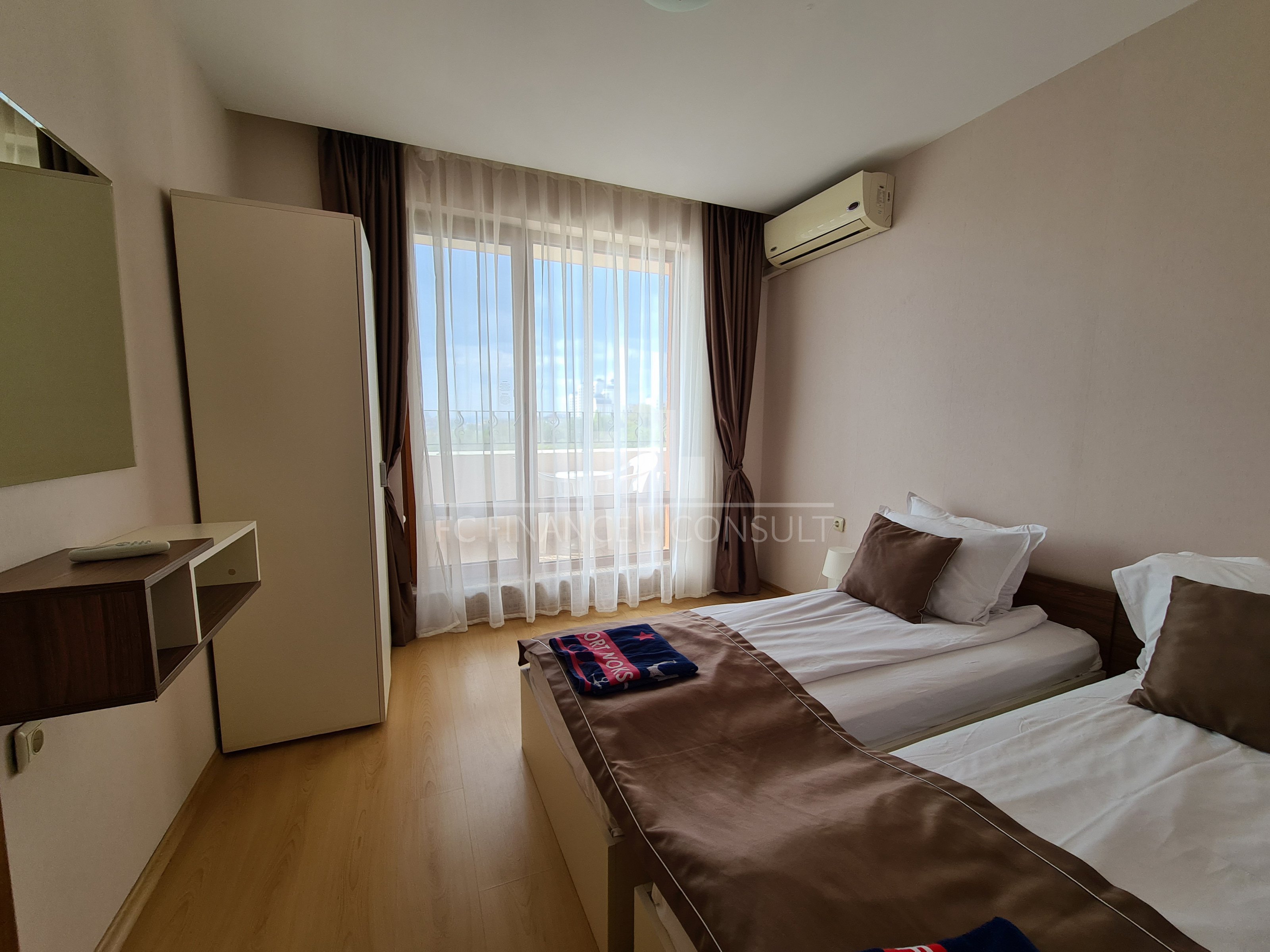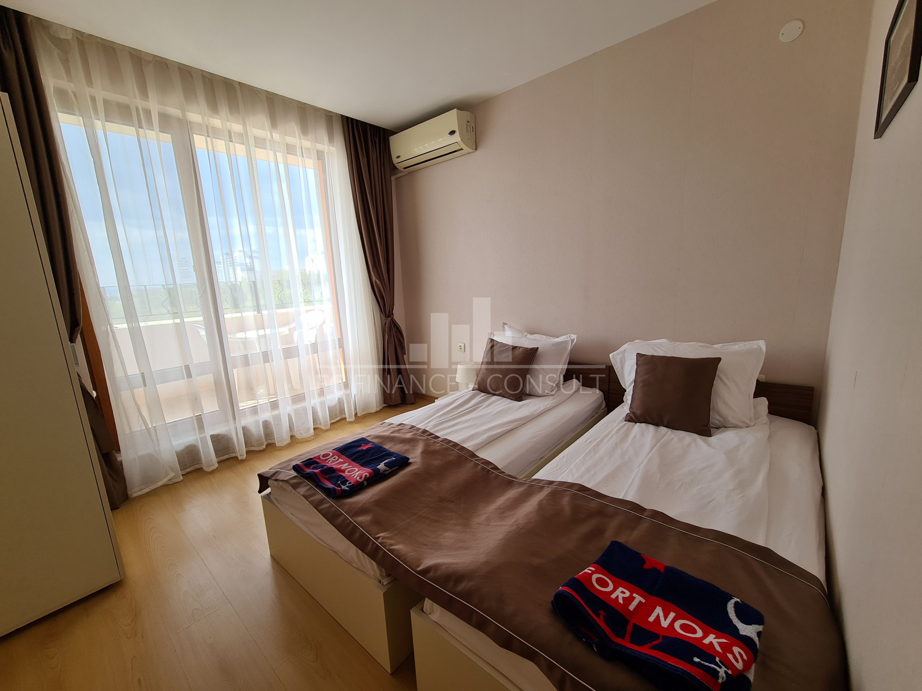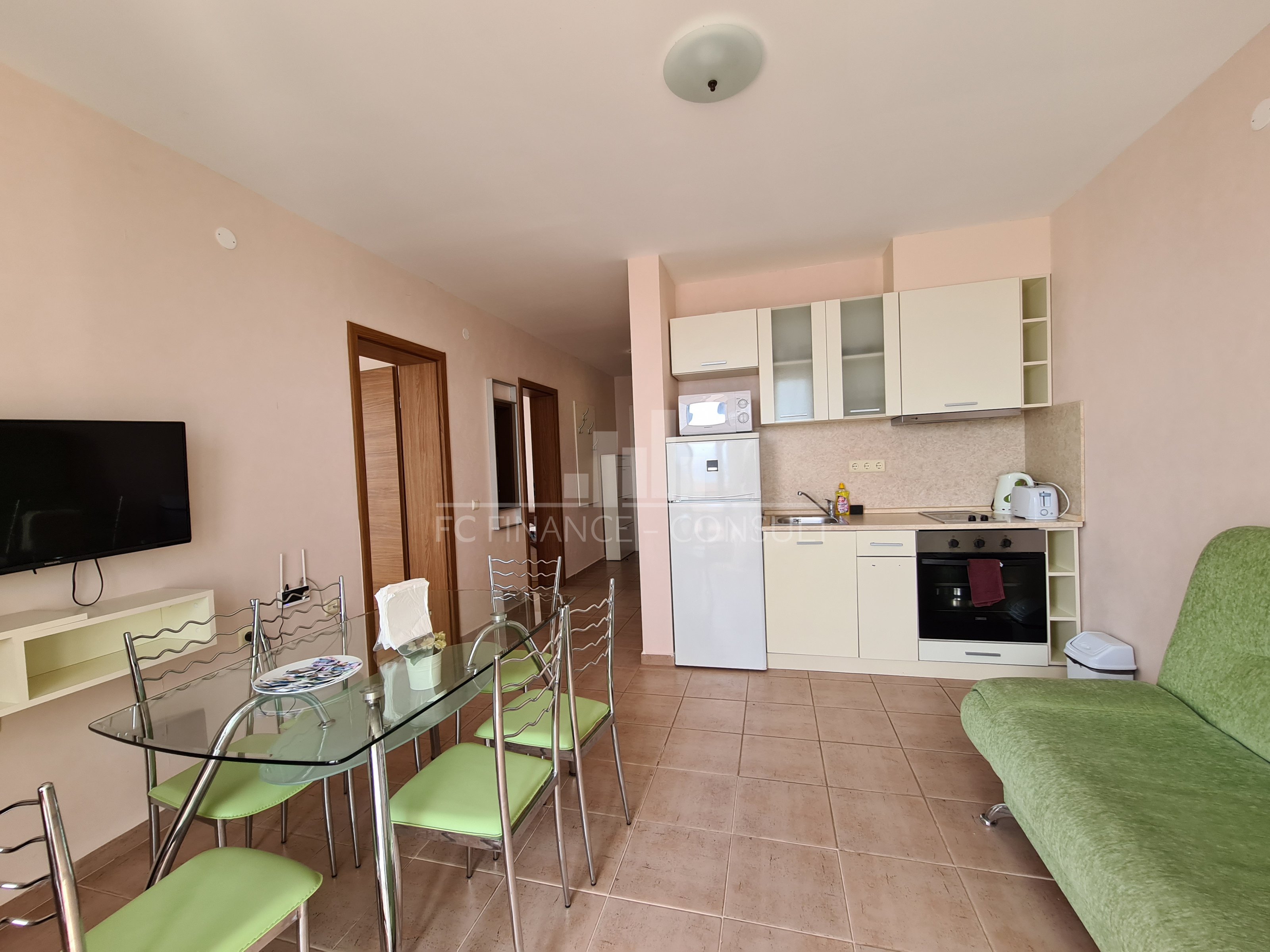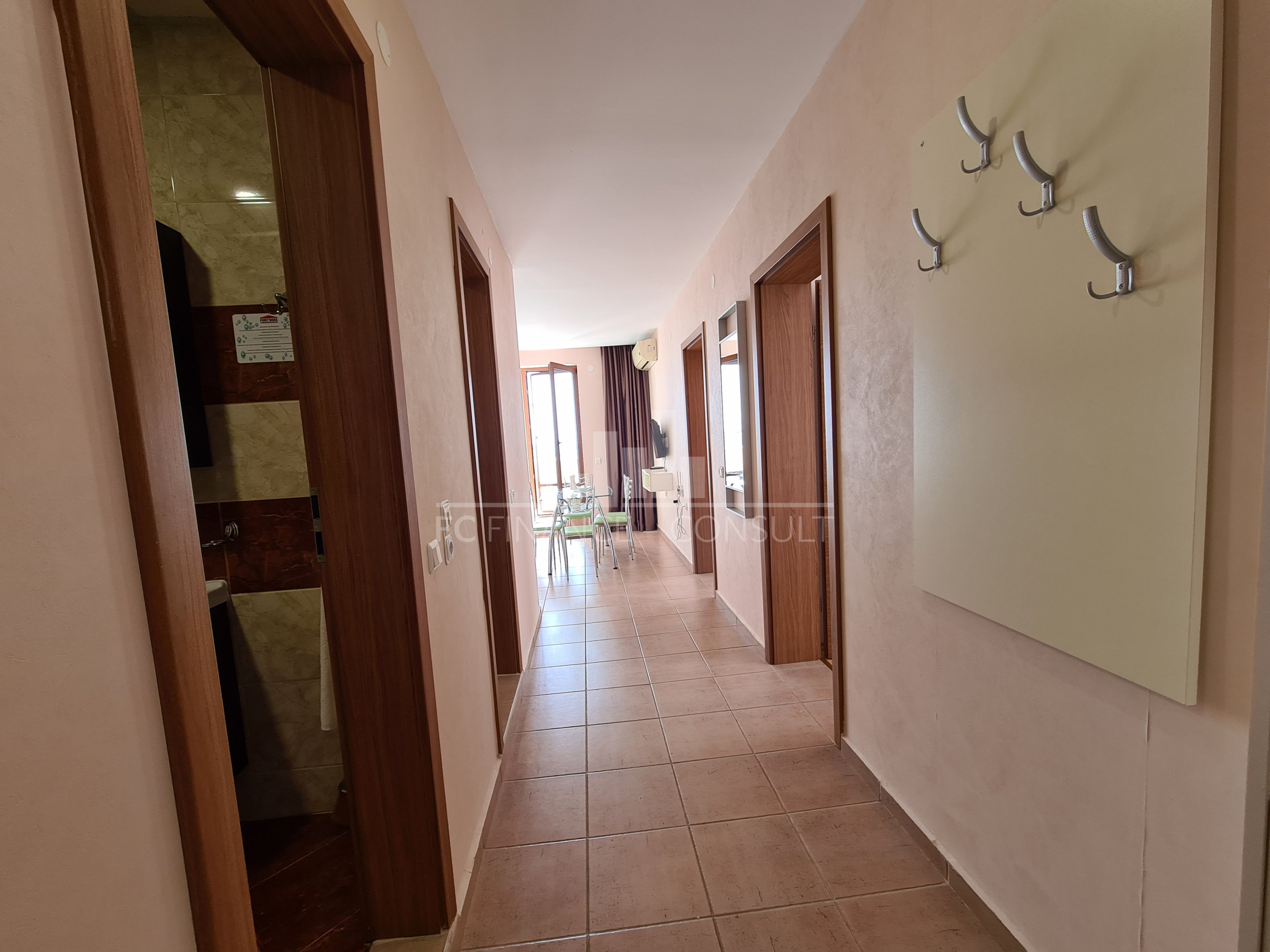 Планировка: прихожая, гостиная с кухонным уголком, 2 спальни, ванная комната с туалетом, балкон. Размер: 86 м2. Этаж: 3 из 5. Возможность рассрочки недвижимости в течение 7 лет: да. Минимальный депозит: 20%. Возможность ежегодного возврата инвестиций: да. Уникальный комплекс апартаментов на первой береговой линии, граничащий с пляжем. Море - окружает, вид с террас большинства апартаментов - как с палубы корабля в открытом море. Апартаменты здесь, это элитная недвижимость Болгарии на берегу моря. Если вы хотите купить уникальную недвижимость в Болгарии на море, то смело выбирайте наш комплекс. Благодаря удачному, хорошо выполненному архитектурному проекту, высокому качеству строительства и использованию гарантированно лучших строительных и отделочных материалов, и самое главное неповторимому, беспроигрышному местоположению на первой береговой линии, комплекс идеальный вариант как для инвестиций, так и для покупки для личного пользования. Апартотель расположен в северной части курорта Солнечный берег, на границе с городком Святой Влас. На территории комплекса расположены следующие объекты и предлагаются следующие услуги: идеальный для плавания тридцатиметровый бассейн, находящийся в центре замечательно устроенного просторного внутреннего двора, детский бассейн, фитнес зал, массажный салон, ресторан с уютной летней площадкой, доступ в интернет на территории, теннисный корт, футбольное поле, детские площадки, зона отдыха, минимаркет, круглосуточная служба сервиса, паркинг, бесплатный для владельцев апартаментов, услуги прачечной а химчистки, круглогодичная круглосуточная охрана. Владельцы апартаментов осуществляют ежегодные платежи в размере 14 евро, с НДС 20%, за метр общей площади апартамента, обеспечивающие: поддержку территории комплекса, общих частей зданий, поддержку и ремонт инфраструктуры и коммуникаций, уход за бассейнами, уход за зелеными насаждениями, круглогодичную круглосуточную охрану, использование шезлонгов у бассейна и зонтов, использование лифтов, освещение общих частей территории, освещение общих частей здания, проветривание и инспекции апартамента в отстутствие хозяев, гарантийный ремонт и поддержка элементов внутренней отделки квартир. За дополнительную плату в комплексе предлагаются разнообразные услуги, все, что может Вам понадобиться во время отдыха в Болгарии на берегу моря!