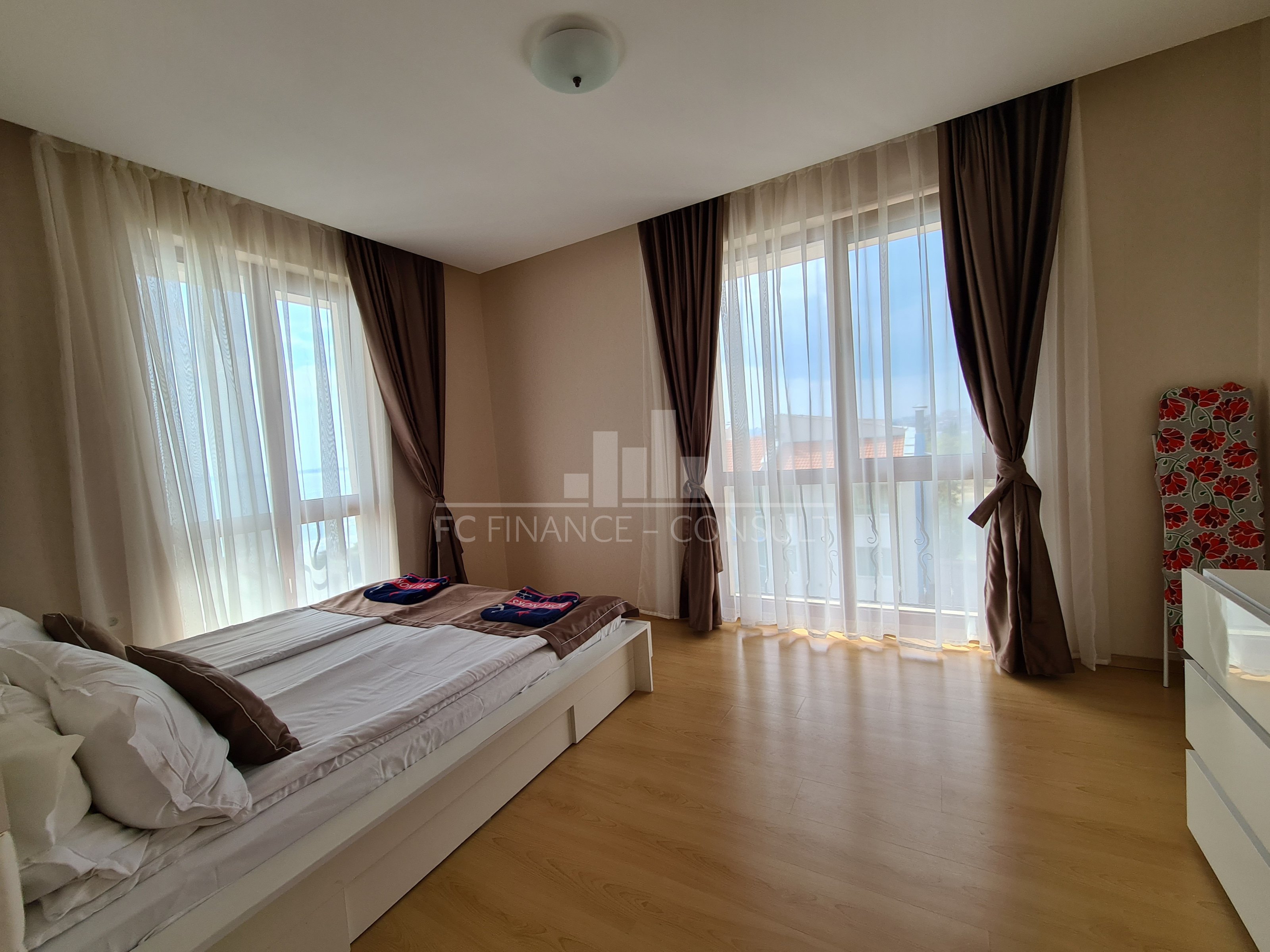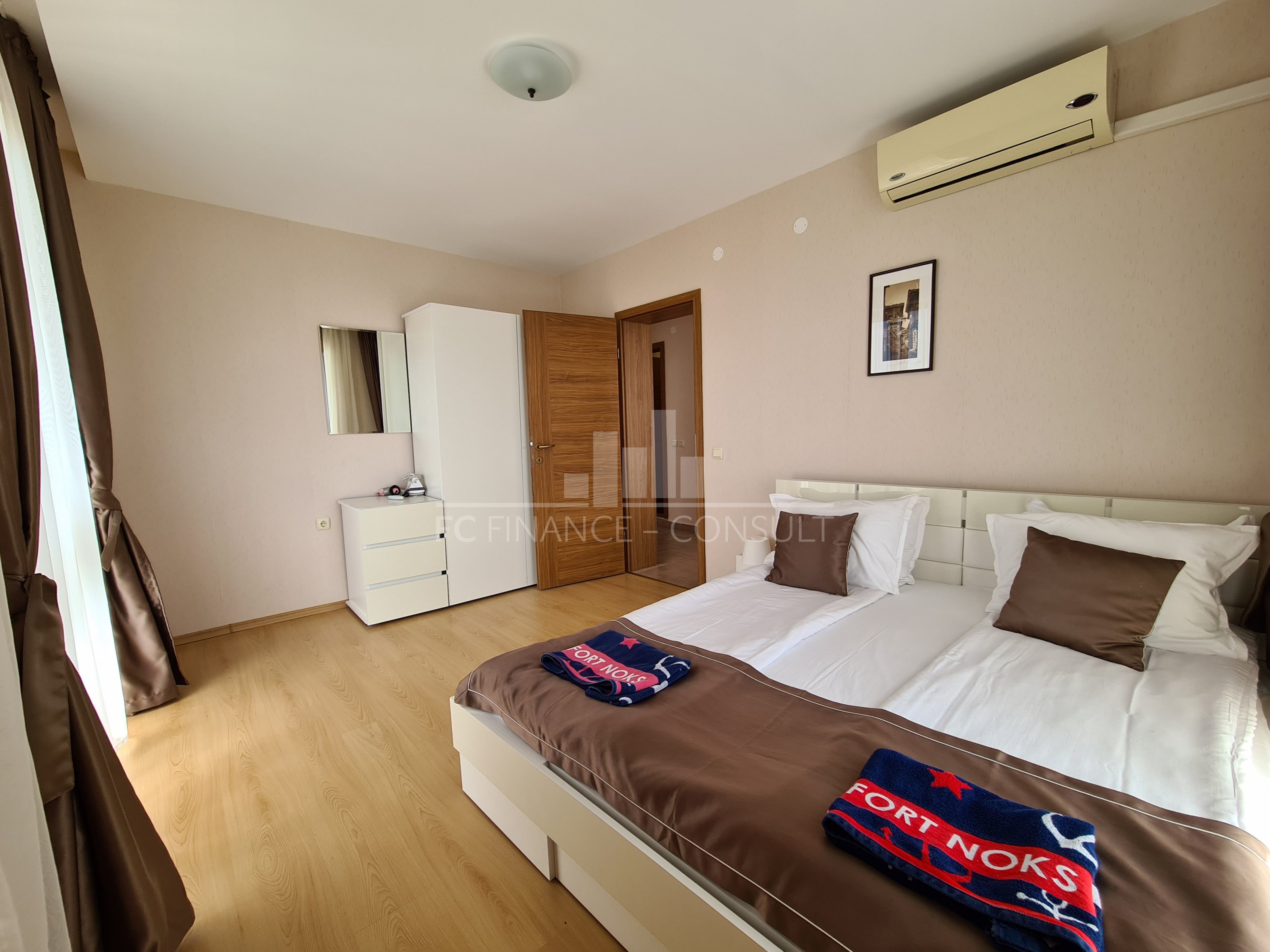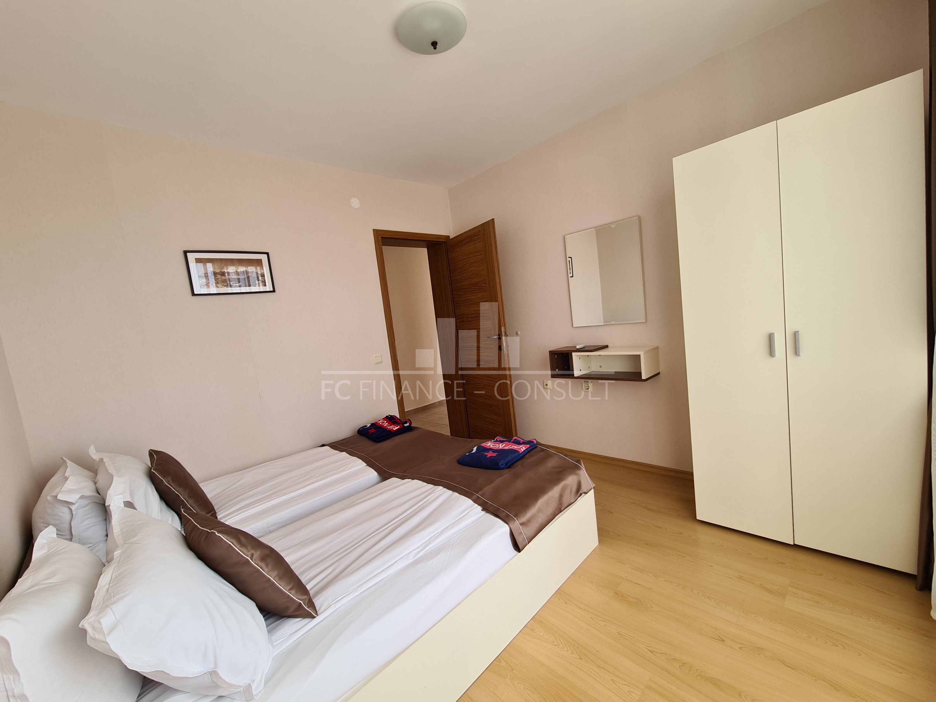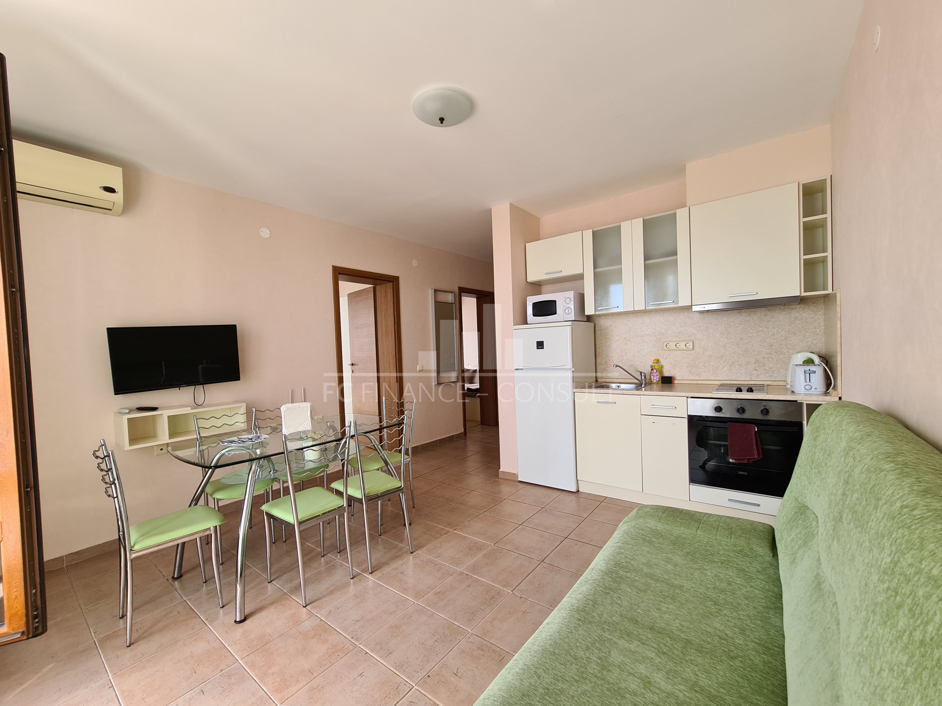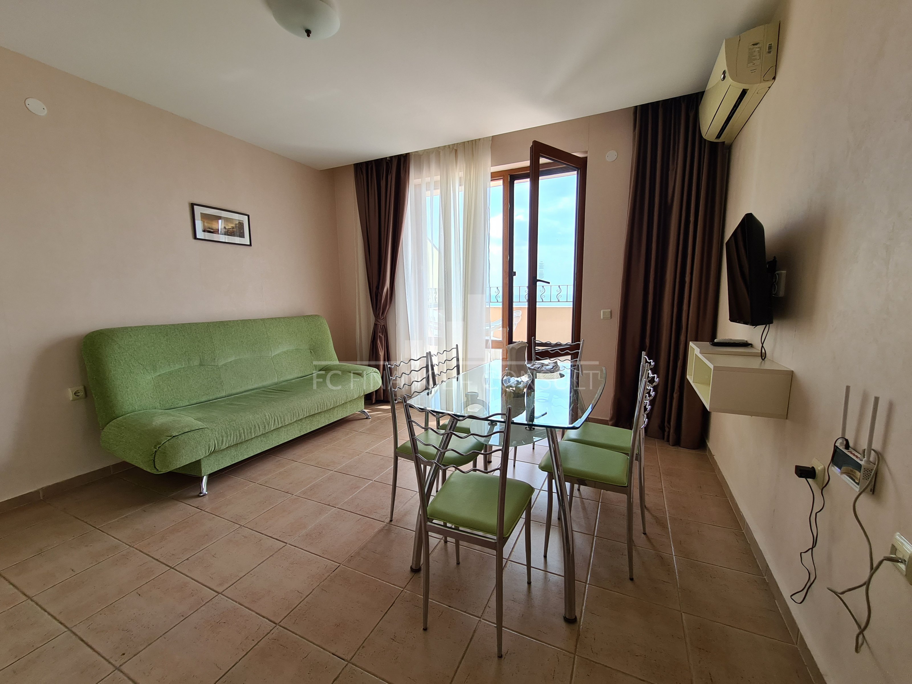 Планировка: прихожая, гостиная с кухонным уголком, 2 спальни, ванная комната с туалетом, балкон. Размер: 86 м2. Этаж: 3 из 5. Возможность рассрочки недвижимости в течение 7 лет: да. Минимальный депозит: 20%. Возможность ежегодного возврата инвестиций: да. Уникальный комплекс апартаментов на первой береговой линии, граничащий с пляжем. Море - окружает, вид с террас большинства апартаментов - как с палубы корабля в открытом море. Апартаменты здесь, это элитная недвижимость Болгарии на берегу моря. Если вы хотите купить уникальную недвижимость в Болгарии на море, то смело выбирайте наш комплекс. Благодаря удачному, хорошо выполненному архитектурному проекту, высокому качеству строительства и использованию гарантированно лучших строительных и отделочных материалов, и самое главное неповторимому, беспроигрышному местоположению на первой береговой линии, комплекс идеальный вариант как для инвестиций, так и для покупки для личного пользования. Апартотель расположен в северной части курорта Солнечный берег, на границе с городком Святой Влас. На территории комплекса расположены следующие объекты и предлагаются следующие услуги: идеальный для плавания тридцатиметровый бассейн, находящийся в центре замечательно устроенного просторного внутреннего двора, детский бассейн, фитнес зал, массажный салон, ресторан с уютной летней площадкой, доступ в интернет на территории, теннисный корт, футбольное поле, детские площадки, зона отдыха, минимаркет, круглосуточная служба сервиса, паркинг, бесплатный для владельцев апартаментов, услуги прачечной а химчистки, круглогодичная круглосуточная охрана. Владельцы апартаментов осуществляют ежегодные платежи в размере 14 евро, с НДС 20%, за метр общей площади апартамента, обеспечивающие: поддержку территории комплекса, общих частей зданий, поддержку и ремонт инфраструктуры и коммуникаций, уход за бассейнами, уход за зелеными насаждениями, круглогодичную круглосуточную охрану, использование шезлонгов у бассейна и зонтов, использование лифтов, освещение общих частей территории, освещение общих частей здания, проветривание и инспекции апартамента в отстутствие хозяев, гарантийный ремонт и поддержка элементов внутренней отделки квартир. За дополнительную плату в комплексе предлагаются разнообразные услуги, все, что может Вам понадобиться во время отдыха в Болгарии на берегу моря!