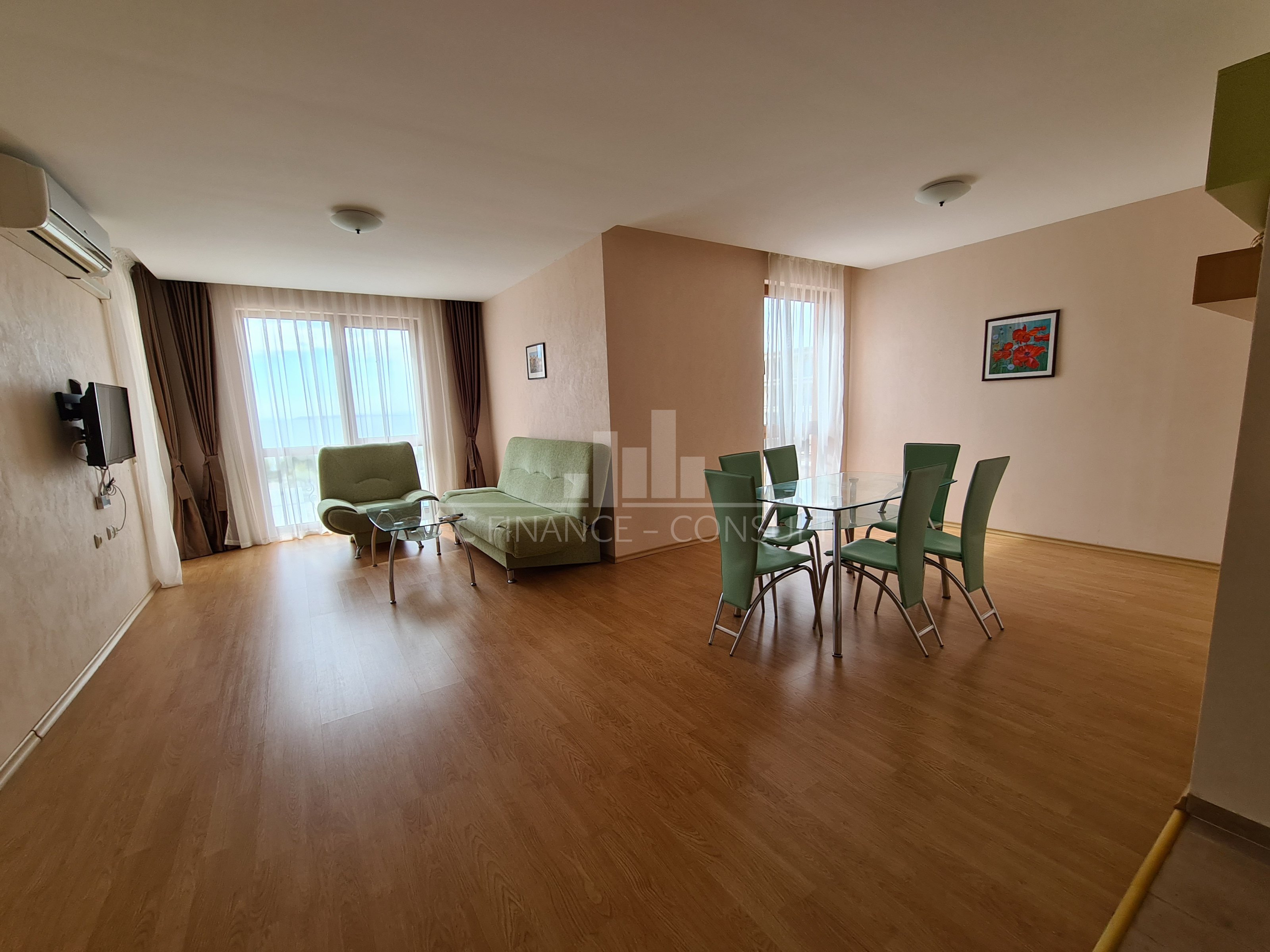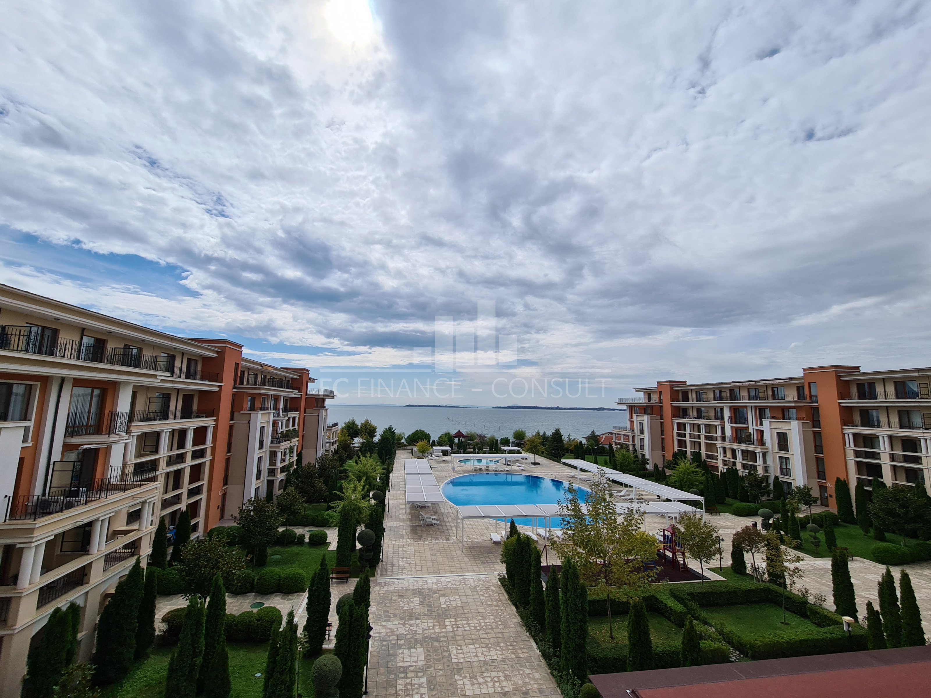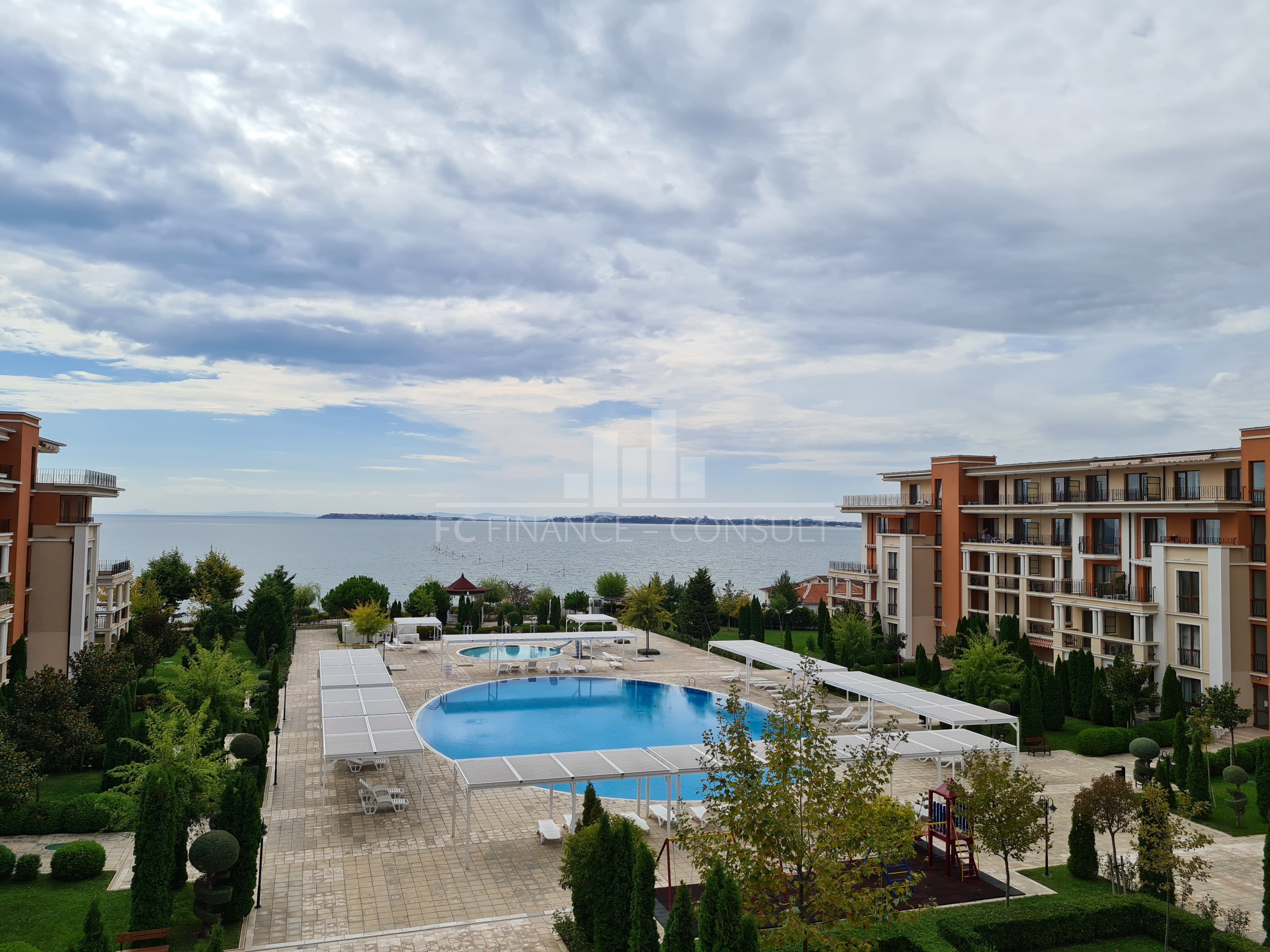 Продажа квартиры, с возможностью отсрочки платежа, с видом на море, бассейн, горы и сад в курорте Святой Влас в Болгарии. Планировка: прихожая, гостиная с кухонным уголком, 2 спальни, ванная комната с туалетом, балкон. Размер: 129 м2. Этаж: 3 из 4. Возможность рассрочки недвижимости в течение 7 лет: да. Минимальный депозит: 20%. Возможность ежегодного возврата инвестиций: да. Уникальный комплекс апартаментов на первой береговой линии. Неповторимый жилищно-курортный комплекс на первой береговой линии, граничащий с пляжем. Море - окружает, вид с террас большинства апартаментов - как с палубы корабля в открытом море. Апартаменты здесь, это элитная недвижимость Болгарии на берегу моря. Если вы хотите купить уникальную недвижимость в Болгарии на море, то смело выбирайте наш комплекс. Благодаря удачному, хорошо выполненному архитектурному проекту, высокому качеству строительства и использованию гарантированно лучших строительных и отделочных материалов, и самое главное неповторимому, беспроигрышному местоположению на первой береговой линии, комплекс идеальный вариант как для инвестиций, так и для покупки для личного пользования. Апартотель расположен в северной части курорта Солнечный берег, на границе с городком Святой Влас. На территории комплекса расположены следующие объекты и предлагаются следующие услуги: идеальный для плавания тридцатиметровый бассейн, находящийся в центре замечательно устроенного просторного внутреннего двора, детский бассейн, фитнес зал, массажный салон, ресторан с уютной летней площадкой, доступ в интернет на территории, теннисный корт, футбольное поле, детские площадки, зона отдыха, минимаркет, круглосуточная служба сервиса, паркинг, бесплатный для владельцев апартаментов, услуги прачечной а химчистки, круглогодичная круглосуточная охрана. Владельцы апартаментов осуществляют ежегодные платежи в размере 14 евро, с НДС 20%, за метр общей площади апартамента, обеспечивающие: поддержку территории комплекса, общих частей зданий, поддержку и ремонт инфраструктуры и коммуникаций, уход за бассейнами, уход за зелеными насаждениями, круглогодичную круглосуточную охрану, использование шезлонгов у бассейна и зонтов, использование лифтов, освещение общих частей территории, освещение общих частей здания, проветривание и инспекции апартамента в отстутствие хозяев, гарантийный ремонт и поддержка элементов внутренней отделки квартир. За дополнительную плату в комплексе предлагаются разнообразные услуги, все, что может Вам понадобиться во время отдыха в Болгарии на берегу моря!