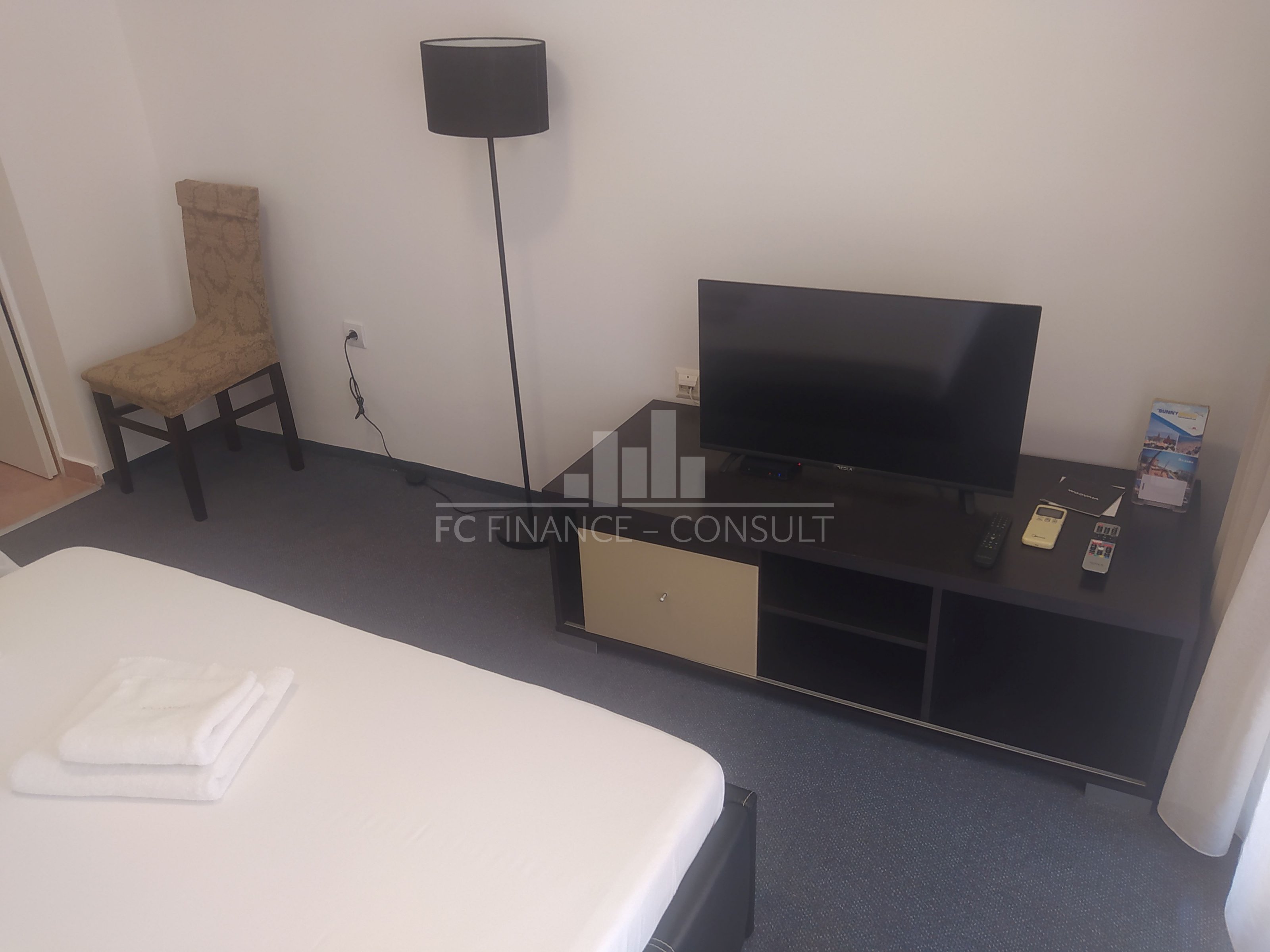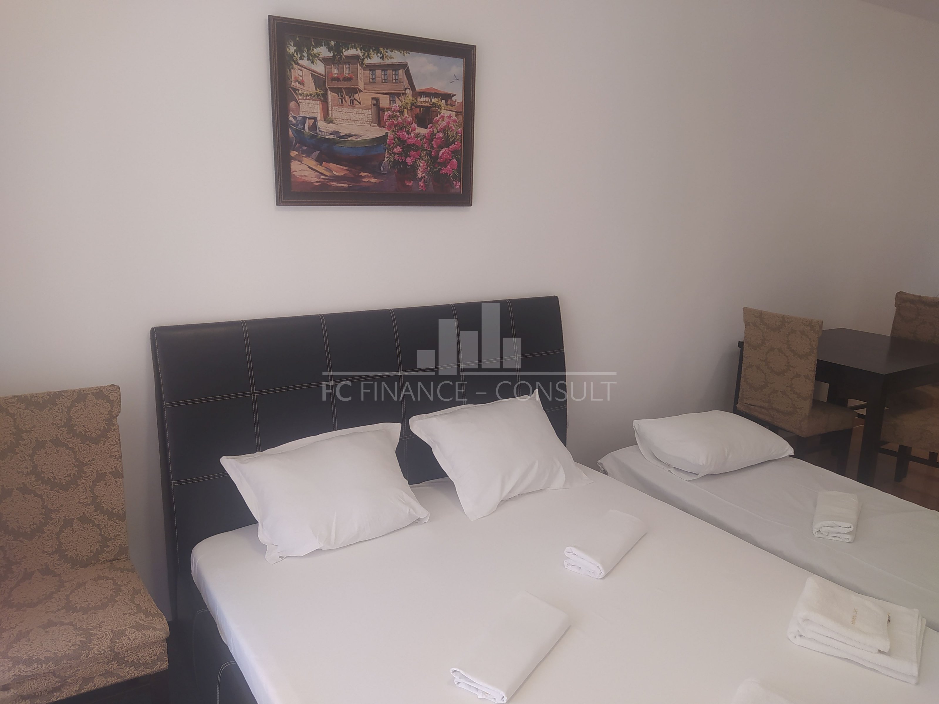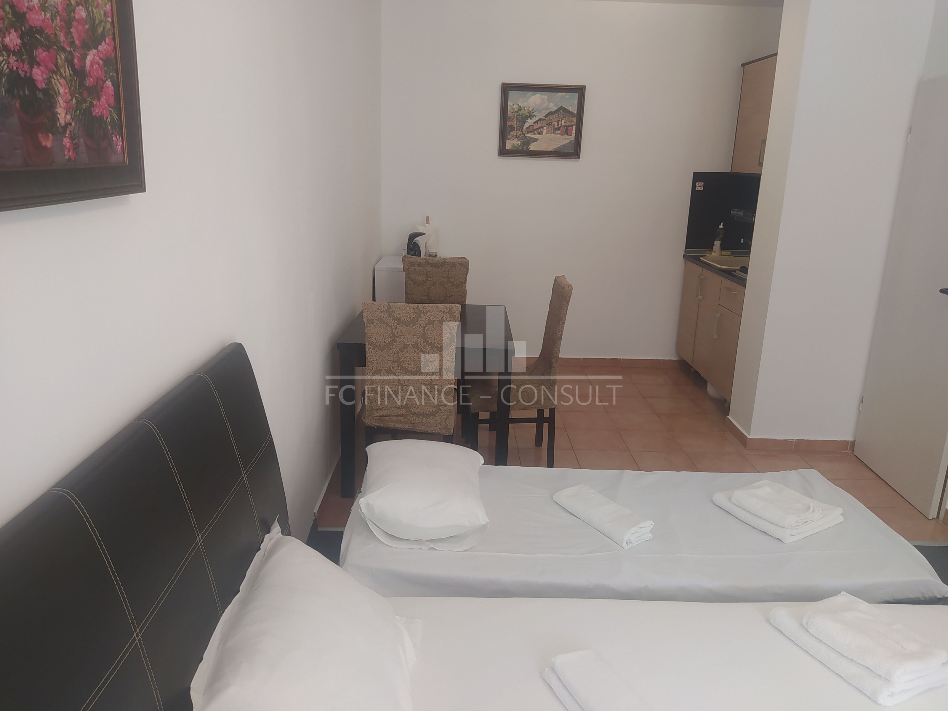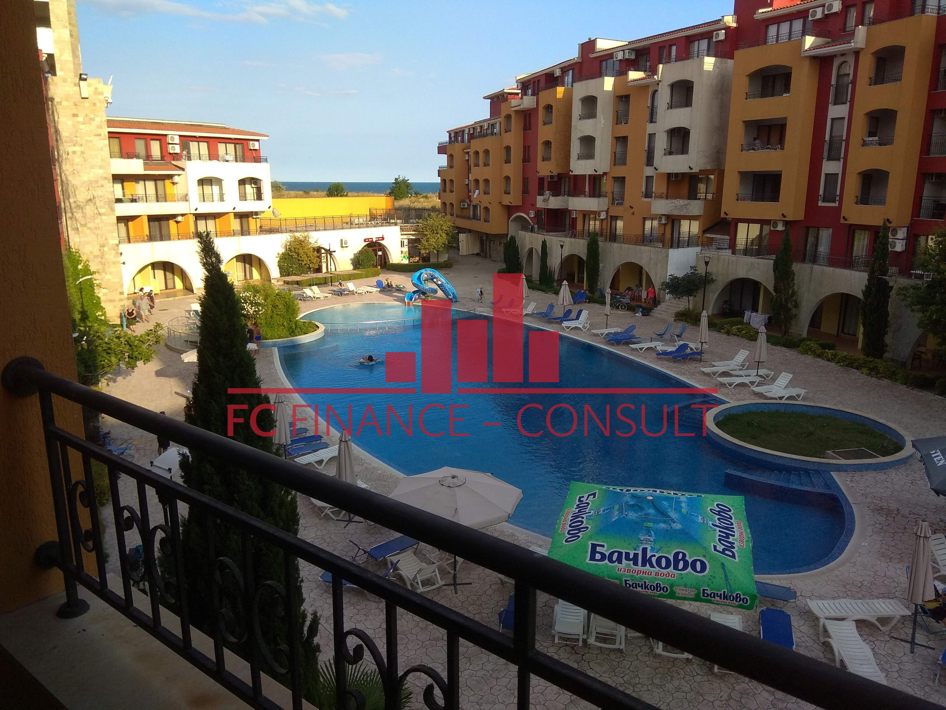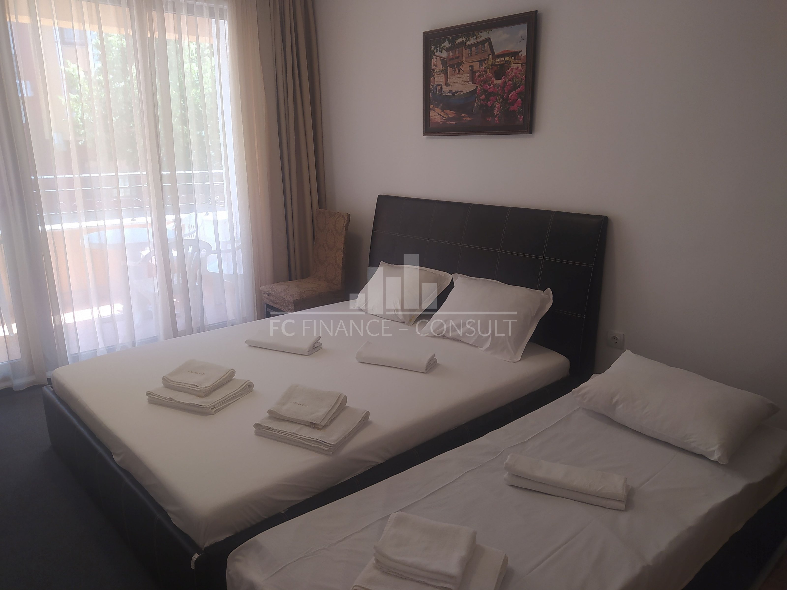 Тип недвижимости: большая студия • Планировка: прихожая, гостиная с кухонным уголком, ванная комната с туалетом, балкон • Размер: 45 м2 • Этаж: 2 из 5 • Вид: сад • Расстояние от пляжа: 10 метров • Обслуживание мест общего пользования: 12 eur/м2 в год • Возможность рассрочки недвижимости в течение 5 лет: да • Минимальный депозит: 20000 евро • Возможность ежегодного возврата инвестиций: да • Расположение и удобства комплекса: комплекс расположен на пляже; бассейны, включая детский бассейн; рецепция; парковка: в комплексе, на улице; ресторан с болгарской/европейской кухней; продуктовые магазины и пляжные удобства; фитнес в помещении; сауна; спа; турецкая баня; детский клуб; детские и спортивные площадки; массажный салон; медицинский центр; туристическое агентство; прокат автомобилей; безопасная парковка; 2 бассейнов для детей и взрослых, шезлонги у бассейна предоставляются бесплатно; теннисный корт; настольный футбол; бильярд и настольный теннис; сквош.