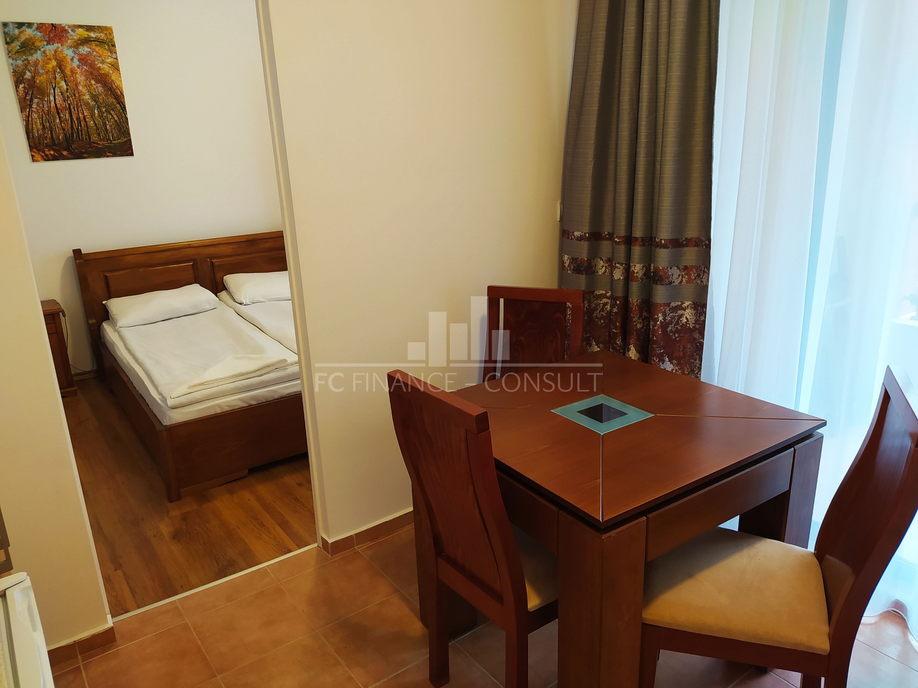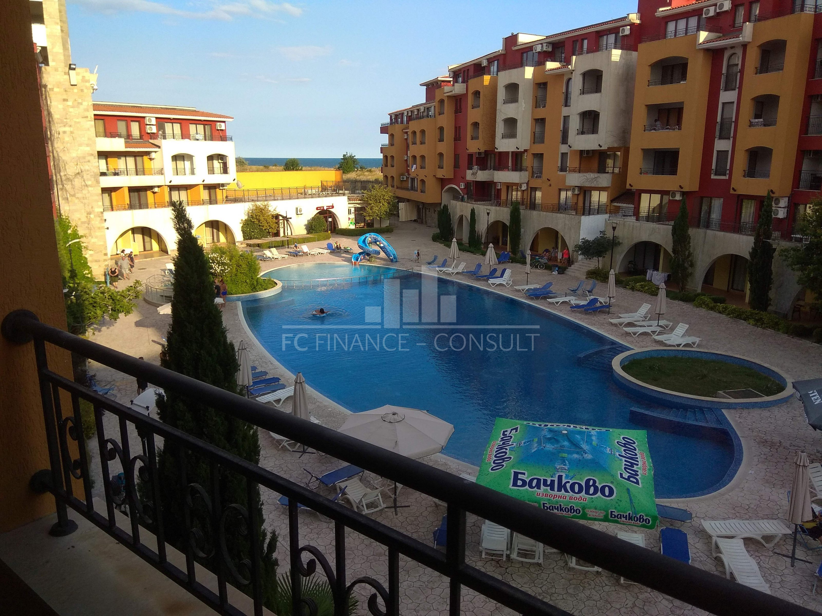 Тип недвижимости: 2-комн • Планировка: прихожая, гостиная с кухонным уголком, спальня, ванная комната с туалетом, балкон • Размер: 45 м2 • Этаж: 4 из 5 • Вид: море, бассейн, сад • Расстояние от пляжа: 10 метров • Обслуживание мест общего пользования: 12 eur/м2 в год • Возможность рассрочки недвижимости в течение 5 лет: да • Минимальный депозит: 20000 евро • Возможность ежегодного возврата инвестиций: да • Расположение и удобства комплекса: комплекс расположен на пляже; бассейны, включая детский бассейн; рецепция; парковка: в комплексе, на улице; ресторан с болгарской/европейской кухней; продуктовые магазины и пляжные удобства; фитнес в помещении; сауна; спа; турецкая баня; детский клуб; детские и спортивные площадки; массажный салон; медицинский центр; туристическое агентство; прокат автомобилей; безопасная парковка; 2 бассейнов для детей и взрослых, шезлонги у бассейна предоставляются бесплатно; теннисный корт; настольный футбол; бильярд и настольный теннис; сквош.